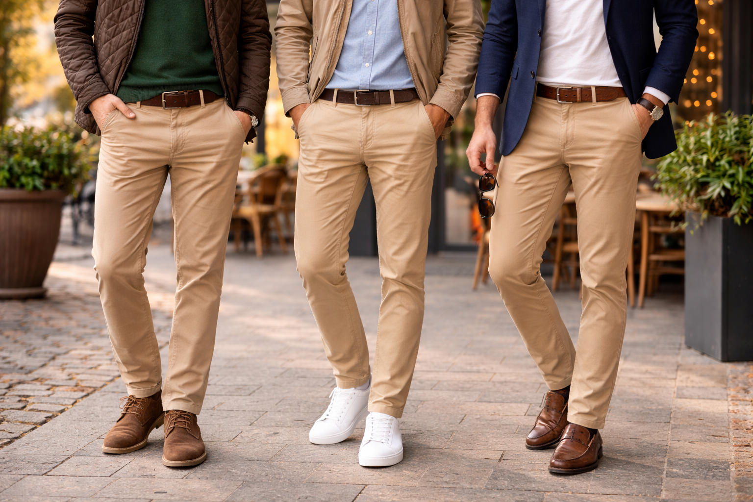• Chino beige + blazer bleu marine → élégance sans effort.
